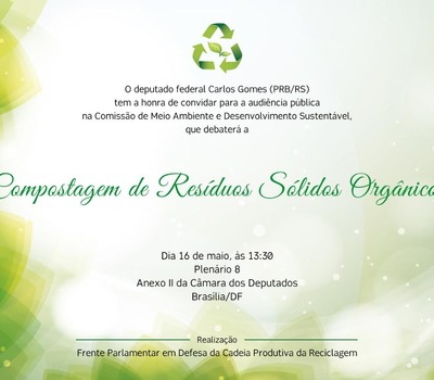 O deputado federal Carlos Gomes (PRB), promoverá no dia 16 de maio na Câmara Federal, audiência pública para debater a compostagem de resíduos sólidos orgânicos no Brasil. O encontro, organizado pela Comissão de Meio Ambiente e Desenvolvimento Sustentável, em parceria com a Frente Parlamentar em Defesa da Cadeia Produtiva da Reciclagem, será realizado a partir das 13h30, no plenário oito do anexo II da Câmara dos Deputados, Brasília/DF.