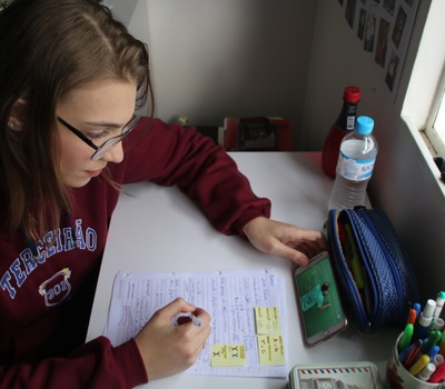 Apesar de passar horas estudando, Emanuele afirma que intercala as disciplinas e busca descansar alguns minutos antes de retomar suas atividades. “Estudo uma matéria, faço exercícios ou resumos. Aí paro, descanso em torno de meia hora, faço um lanche, e retomo com outra disciplina, e assim por diante”, relata a jovem.
