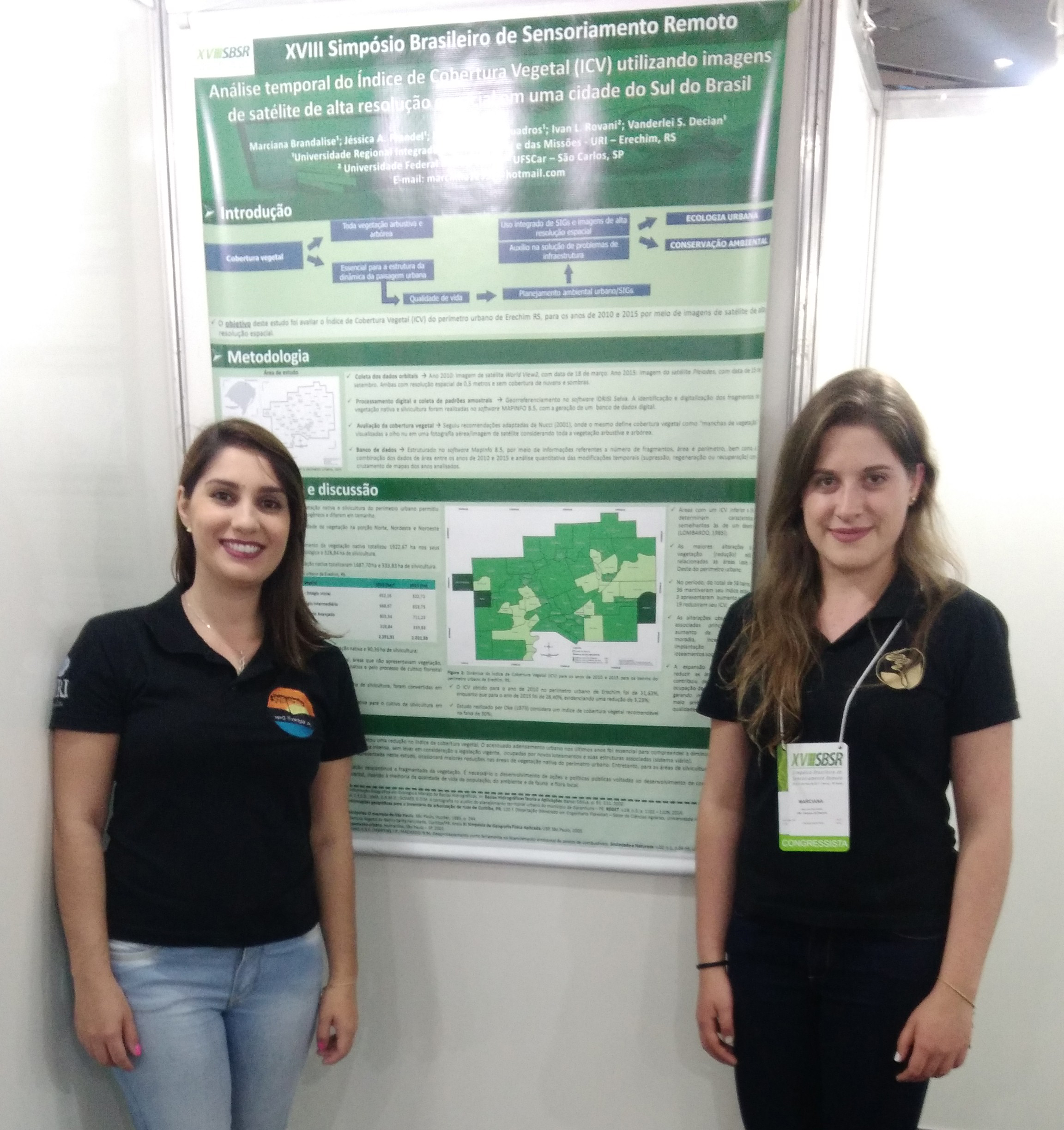 As acadêmicas Jéssica Aparecida Prandel, do Curso de Pós-Graduação em Ecologia, e Marciana Brandalise, do Curso de Ciências Biológicas Bacharelado, da URI Erechim, participaram do XVIII Simpósio Brasileiro de Sensoriamento Remoto, em Santos, São Paulo. O evento, realizado de 28 a 31 de maio, é considerado o maior da América Latina nessa área. A organização foi do Instituto Nacional de Pesquisas Espaciais (INPE) e Associação de Especialistas Latinoamericanos em Sensoriamento Remoto (SELPER Brasil).