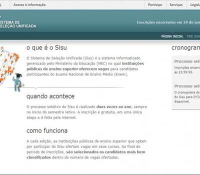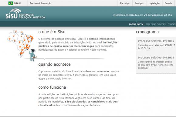 Termina hoje (1º) o prazo de inscrição no Sistema de Seleção Unificada (Sisu). A inscrição pode ser feita pela internet, no site do programa. Para se inscrever, o candidato precisa apenas do número de inscrição e senha cadastrados no Exame do Ensino Médio (Enem) de 2016. Até a tarde de ontem (31), o Sisu registrou 748.185 inscritos, de acordo com balanço do Ministério da Educação (MEC).