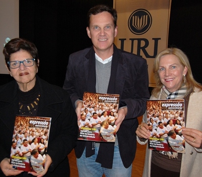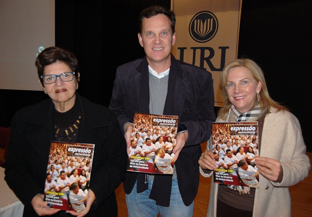 Na segunda noite da semana integrada dos cursos de Pedagogia e Letras aconteceu, também, o lançamento da nova Revista Expressão Universitária, ocasião em que o professor Rodrigo Cechett – coordenador da Assessoria de Marketing e Comunicação do Câmpus – relembrou a trajetória da publicação como um dos meios de comunicação com públicos interno e externo, divulgando atividades de ensino, pesquisa e extensão levadas a cabo pela URI Erechim. Rodrigo falou sobre a nova proposta editorial, bem como do novo layout do periódico. Em seguida, fez a entrega dos dois primeiros exemplares à professora Tania Rösing e à professora Lúcia Balvedi Pagliosa, mestre de cerimônia do evento e que esteve à frente, por vários anos, da Assessoria de Comunicação e da própria Expressão Universitária.