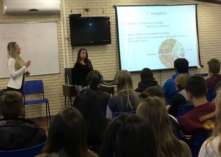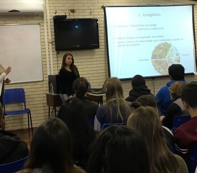 A palestra para as turmas do 9º ano e Ensino Médio foi ministrada pelas acadêmicas Caroline Neis e Júlia Martinello, da turma 2014, supervisionadas pela professora Roseana Baggio Spinelli. O encontro versou sobre a importância da alimentação adequada e saudável, preconizada pelo Ministério da Saúde, através do Guia Alimentar para a População Brasileira de 2014.