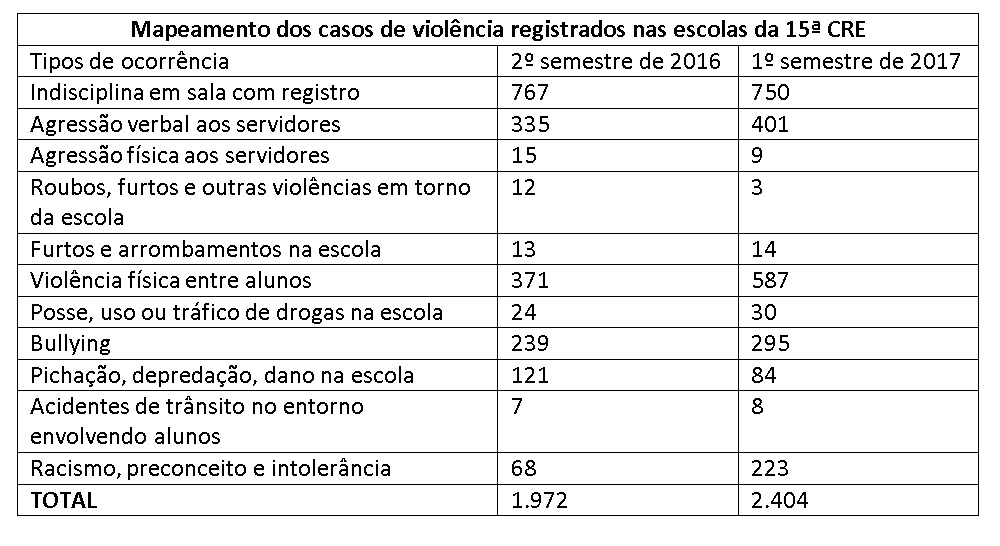 Conforme o mapeamento, os casos de maior incidência são os de indisciplina em sala de aula, com 750 registros. Em seguida a violência física entre alunos, que somaram 587 casos no primeiro semestre de 2017 – 216 a mais do que no último semestre de 2016. Registros de Bulliyng também chamam atenção: foram 295 registros. Outro dado que chama atenção é relacionado aos casos de racismo, intolerância e preconceitos: do último semestre de 2016 para o primeiro de 2017 os registros deste tipo de violência subiram de 68 para 223 casos.