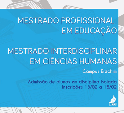 Estarão abertas, no período de 15 a 18 de fevereiro, as inscrições para os interessados em cursar disciplinas isoladas no Mestrado Interdisciplinar em Ciências Humanas e no Mestrado Profissional em Educação da Universidade Federal da Fronteira Sul (UFFS), ambos ofertados no Campus Erechim.