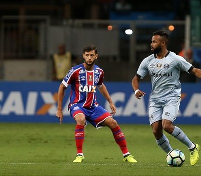 O primeiro tempo foi equilibrado e sem chances claras de gol. O Bahia foi quem iniciou melhor, pressionando nos minutos iniciais e obrigando Paulo Victor a fazer boas defesas. Aos poucos os gremistas trabalharam melhor a bola e conseguiram impor um pouco mais o seu ritmo.