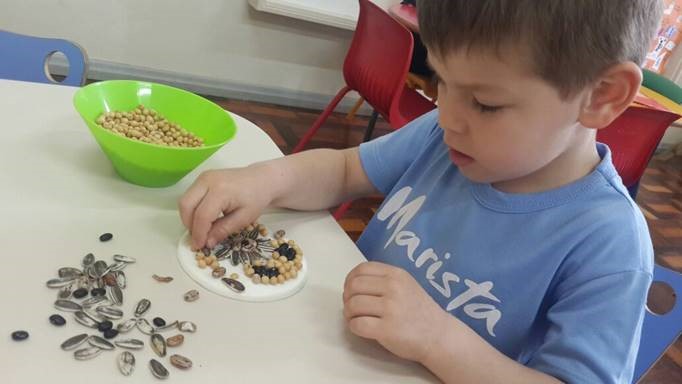 Na parte prática, a primeira atividade foi a pintura com sementes, em que a criatividade e a livre exploração foram os elementos principais. Após, foram confeccionados nas aulas de Musicalização, instrumentos percussivos utilizando algumas sementes trazidas de casa pelos estudantes. Então, foi realizada uma assembleia, em que as crianças debateram e votaram quais sementes seriam plantadas e cultivadas pelas turmas.