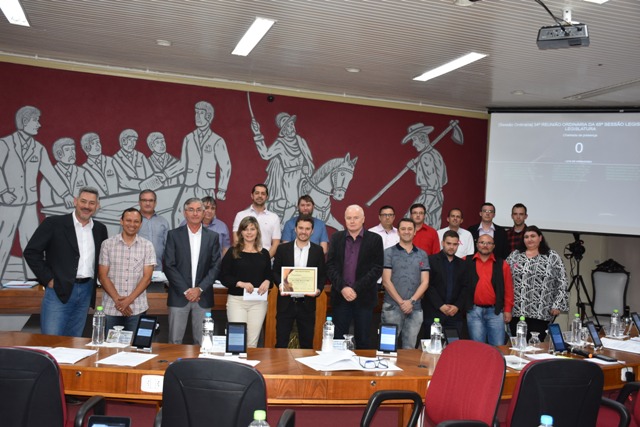 A placa que representa os votos de congratulações foi recebida pelo diretor da escola, Alan Brasolin