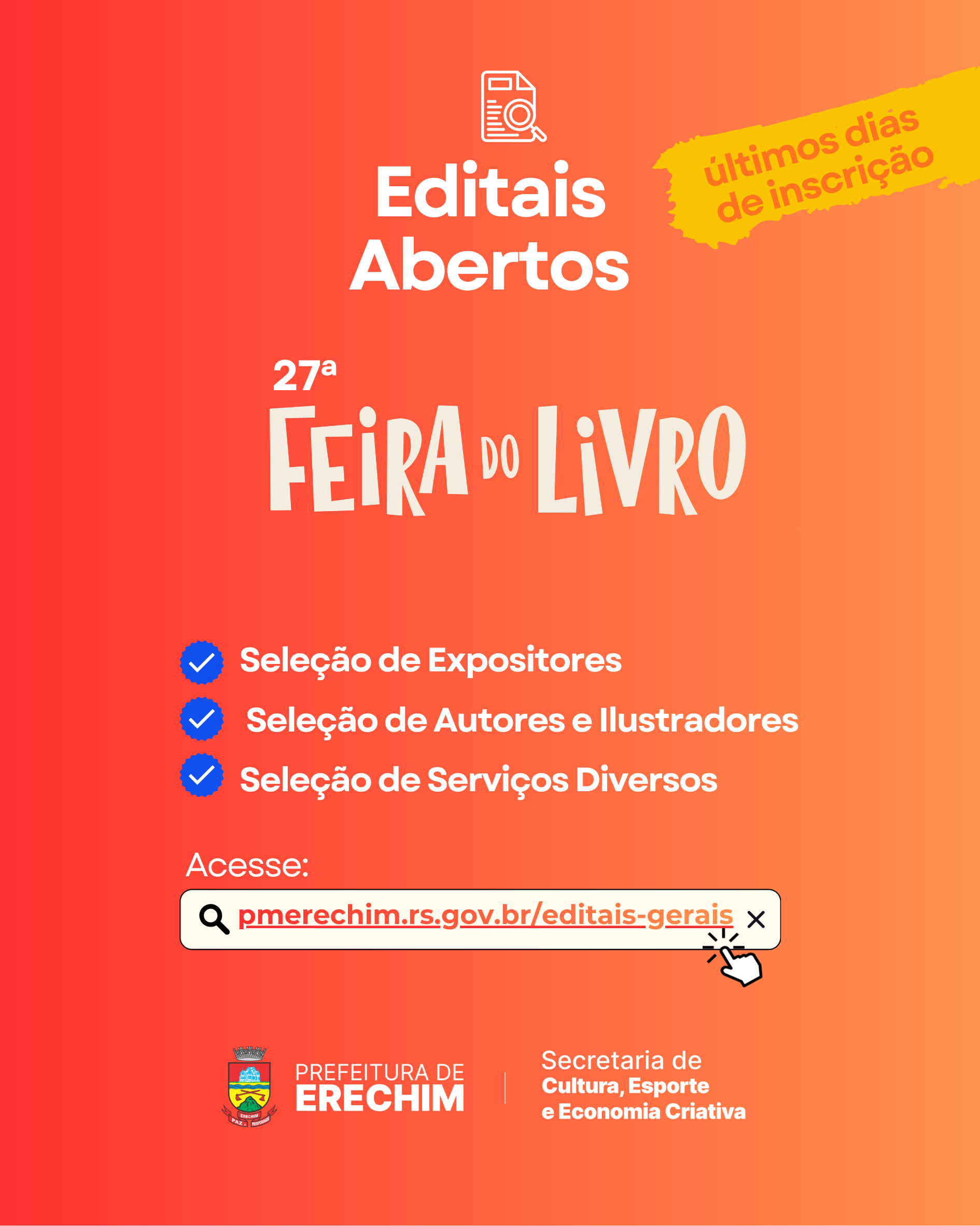 A solenidade oficial de abertura da 19ª Feira do Livro de Erechim acontece neste sábado (21), às 15h, na Praça Jaime Lago, com participação da Sociedade Banda de Música de Erechim, no Palco Boa Vista. Com o tema Conhecimento e afeto para educar e libertar, a feira se estende até o dia 28, com horário de funcionamento sempre das 9h às 22h.