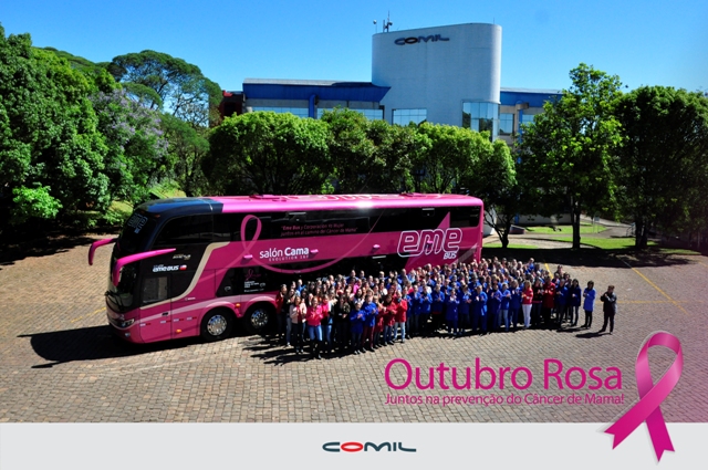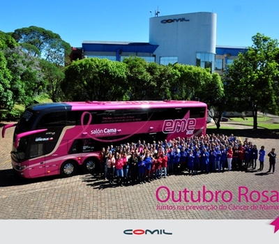 "Juntos na prevenção do câncer de mama e do câncer de próstata", é o slogan da campanha da Comil ônibus aderindo ao movimento do Outubro Rosa e Novembro Azul. A empresa preparou uma programação especial, com ações que integram os dois temas, com o objetivo de poder falar abertamente tanto para os homens sobre a prevenção do câncer de mama, quanto para as mulheres sobre a prevenção do câncer de próstata, para que possam estender a campanha para seus familiares e amigos.