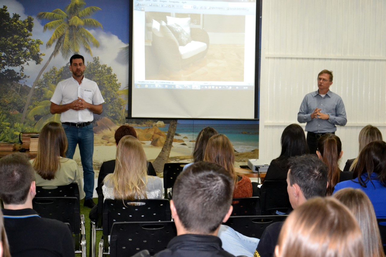 A De Bett Cortinas e Persianas promoveu uma palestra, para arquitetos, na manhã de quinta-feira (23), com o consultor comercial da Indusparquet, Fábio Valério dos Santos. O objetivo era de mostrar como os produtos Indusparquet podem ser usados do piso ao teto e a versatilidade da composição de mosaicos e grafismos em pisos e painéis. Ele apresentou cores, tendências e as três principais linhas de pisos desenvolvidos para atender a grande demanda mundial por produtos ecológicos: Maciço, Multistrato e Multiestruturado. A recepção aos profissionais foi feita pelos empresários Luciano e Isabel Bettio e Augusto Bettio.