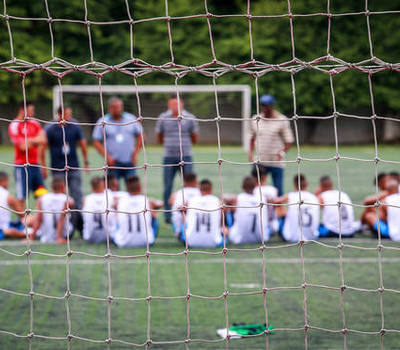 Antes das partidas do torneio, cada unidade organiza seus treinos. Na capital, eles acontecem uma vez por semana no campo do Benfica, ali na Vila Maria. Também com autorização judicial, os meninos chegam em silêncio, em uma van branca, com quatro agentes de segurança. O treino tem a parte física, técnica e tática, como uma escolinha de futebol.