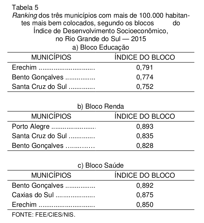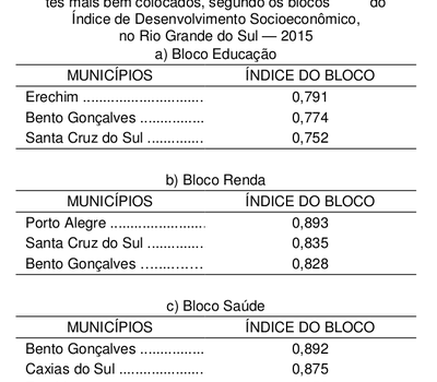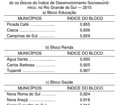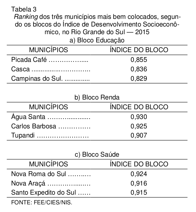 Na classificação por municípios, o primeiro colocado continuou sendo o Município de Carlos Barbosa (0,879 em 2015), localizado no Corede Serra. Na segunda posição, o município de Água Santa, localizado no Corede Nordeste, obteve índice de 0,873. Em seguida na classificação, Nova Araçá, situado no Corede Serra, apresentou índice de 0,865. Para o estatístico Rafael Bernardini, não há grandes surpresas nesses resultados, uma vez que a classificação segue padrão já conhecido acerca do desenvolvimento no RS. “Os municípios das áreas de colonização em pequenas propriedades, localizados, em sua maioria, no norte e no nordeste do Estado, apresentam indicadores mais altos de desenvolvimento”, explica. Depois de Carlos Barbosa, Água Santa e Nova Araçá, os municípios mais bem colocados no Idese são, respectivamente: Aratiba, Nova Bassano, Veranópolis, Ipiranga do Sul, Garibaldi, Paraí, Bozano.