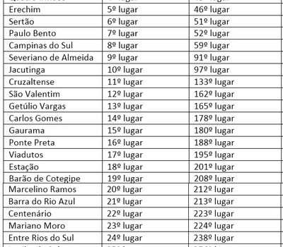 O município de Aratiba ficou no 4º lugar geral e Ipiranga do Sul em 7º. A maior cidade da região, Erechim, na colocação geral conquistou o 46º lugar, porém, em outro estudo realizado pela FEE, em municípios acima de 100 mil habitantes, a Capital da Amizade ficou na terceira posição, mas no bloco educação, está em primeiro lugar. Nos outros dois blocos que compõe o estudo, está em 3º lugar na saúde e 5º na renda.