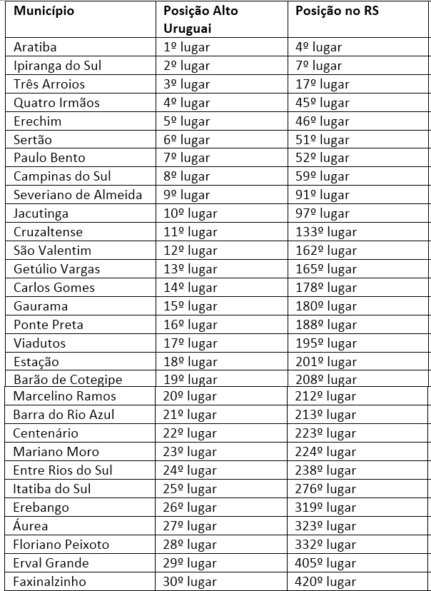A avaliação também é feita por Conselhos Regionais de Desenvolvimento, e o que representa o Alto Uruguai – Corede Norte – ficou em 3º lugar geral. Todos esses dados são relativos ao ano de 2015 e com a revisão dos dados de 2014.