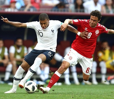 Perto dos 30 da primeira etapa, a França tinha cerca de 65% de posse de bola, contra apenas 35% da Dinamarca, que, recuada, parecia estar muito satisfeita com o empate sem gols. Aos 33, foi a vez de Dembélé tentar chegar ao gol. Ele recebeu passe da meia direita, deu um drible em Delaney e chutou firme, mas a bola passou ao lado da trave direita do goleiro dinamarquês.