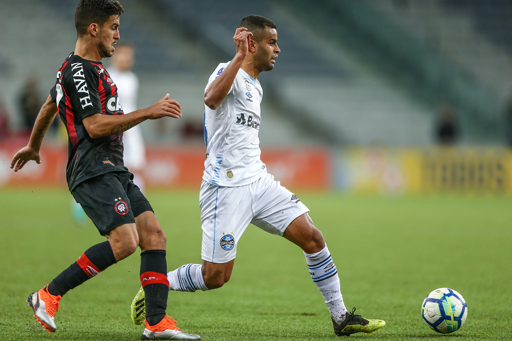 O Grêmio tentou chegar com uma jogada de Alisson, mas a defesa do Furacão fez mais uma vez o corte.
