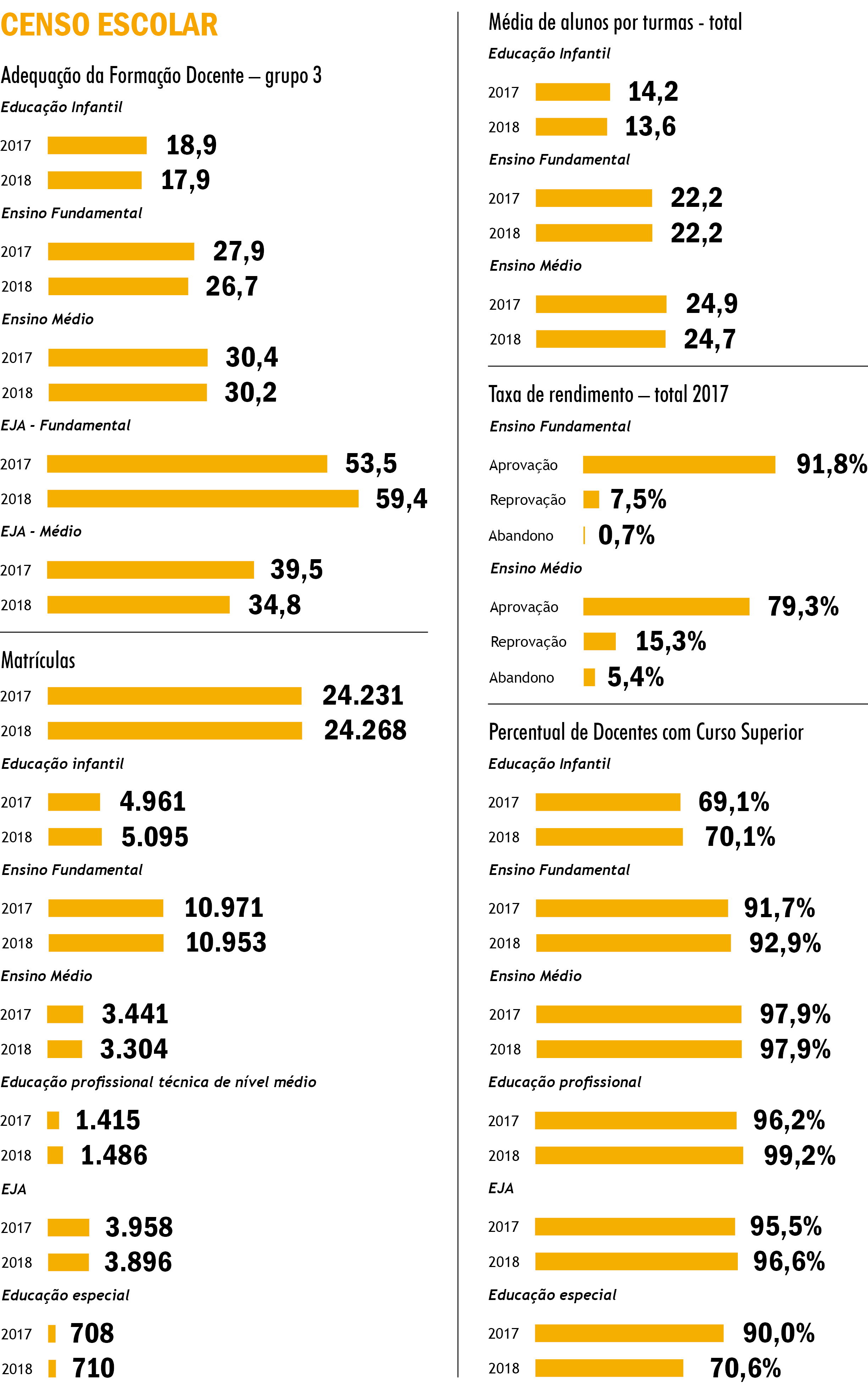 O censo analisa 14 indicadores e nesta edição apresentamos gráficos que ilustram resultados dos anos de 2017 e 2018, para alguns indicadores das escolas de Erechim, considerando todas as redes: municipal, estadual e privada. Com relação a taxa de rendimento dos alunos, como faz parte da segunda etapa, os dados de 2018 ainda não foram calculados, portanto, só há de 2017 no sistema do MEC.