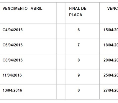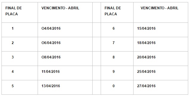 Prazo para pagar o IPVA 2016 será em abril/06, conforme o final de placa. Verifique o seu clicando no calendário do IPVA ou na tabela abaixo: