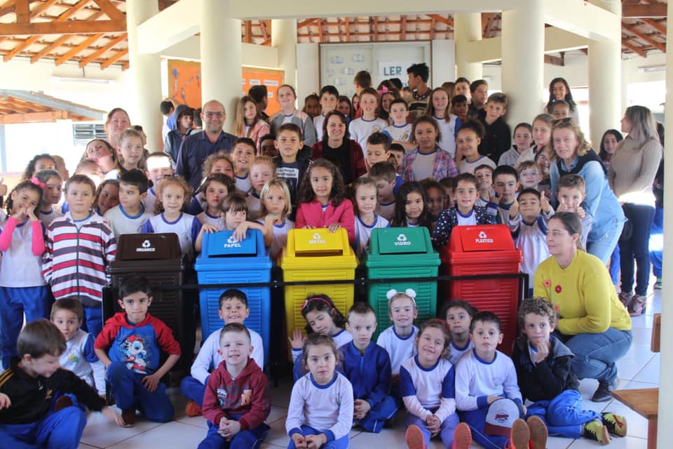 Na parte da tarde, Excelentíssimo Prefeito Municipal Ediomar Brezolin, o Secretário Municipal de Agricultura e Meio Ambiente Gleison Helon Bessegato, a Secretária Municipal de Educação e Cultura Jaquelina Clara Conte e a Bióloga Lorien Refosco, pensando na formação dos cidadãos desde cedo, realizaram a entrega de lixeiras seletivas para as Escolas do Município de Paim Filho.