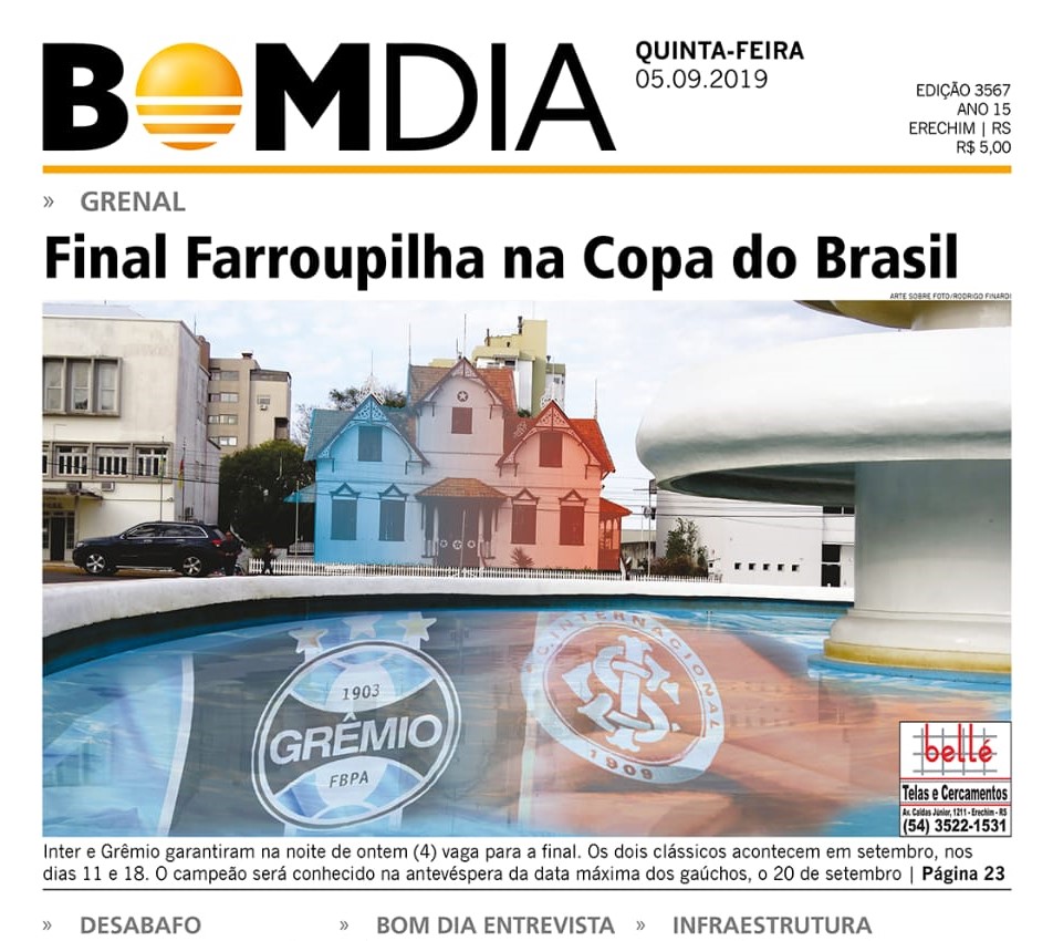 Não tivemos dúvida e cravamos o título: “Final Farroupilha na Copa do Brasil”. E puxando para Erechim, foi usada uma foto do chafariz (reflexo do símbolo do Inter e do Grêmio) sobre a água e o Castelinho dividido ao meio, metade azul e metade vermelho.
