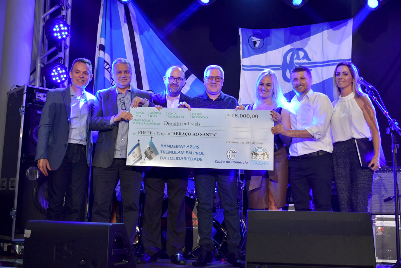 Um jantar-baile realizado no Clube do Comércio, na noite de sábado, 26 de outubro, marcou a entrega de um cheque de R$ 18 mil ao Hospital Santa Terezinha de Erechim. O valor é resultado da parceria entre o Clube do Comércio e o Consulado do Grêmio, que, juntos, desenvolveram a Campanha "Bandeiras Azuis Tremulam em prol da Solidariedade".