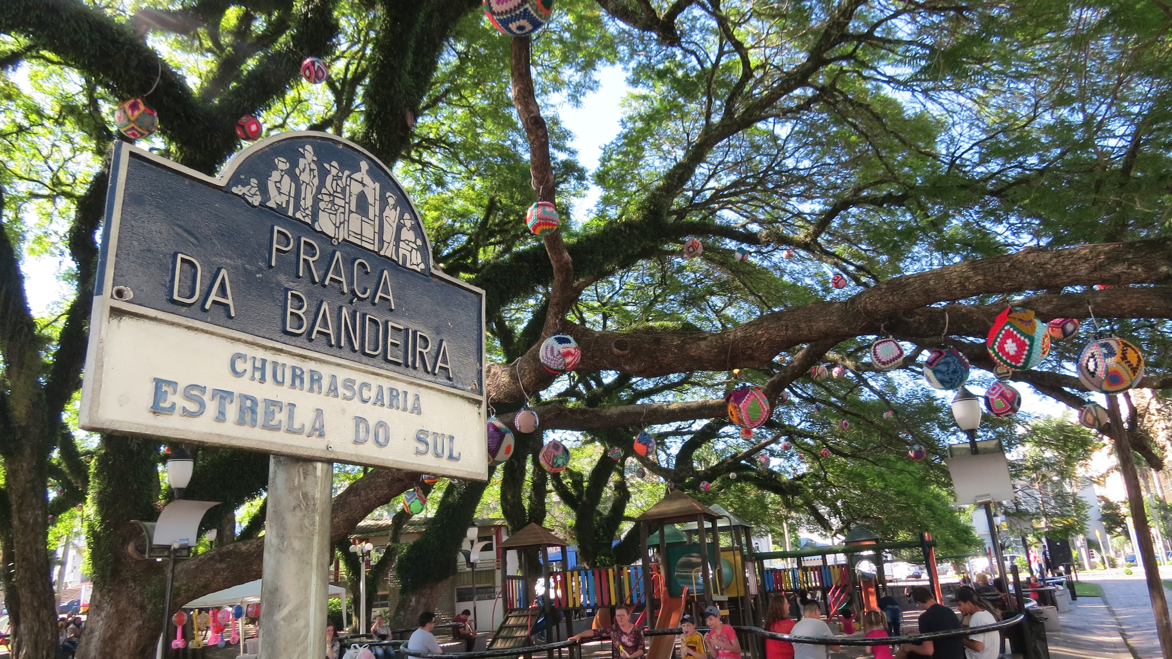 Nossa presença foi uma surpresa. Não foi agendado nada com a equipe presente ao local do Jornal Bom Dia, que participava do congresso de jornalismo. O casuísmo e a ideia desenvolvida pelo município, explanada no dia anterior em palestra, nos aguçou a curiosidade do que estava sendo feito. E decidirmos conhecer a Praça da Bandeira deles, no coração da cidade, com árvores centenárias, e muita sombra para adultos e crianças.