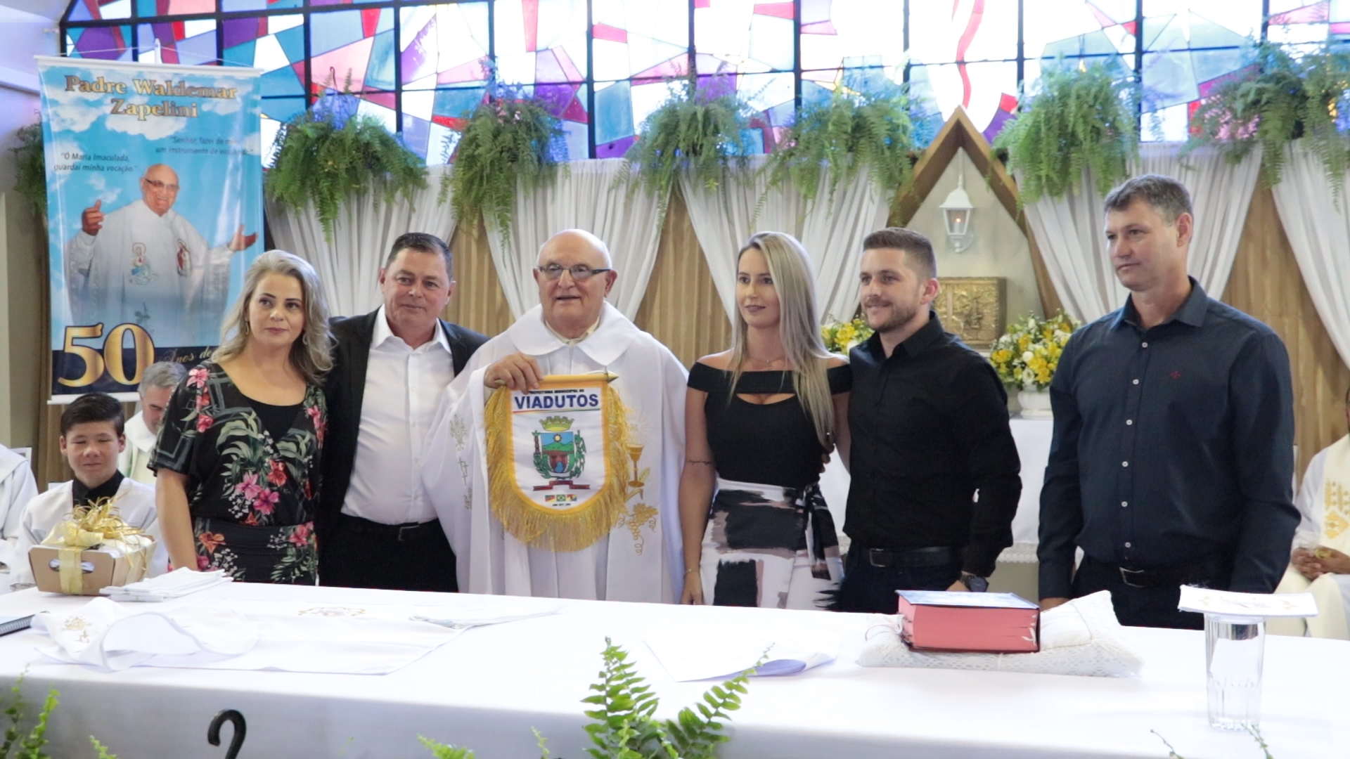 A Igreja matriz Sagrado Coração de Jesus de Viadutos sediou, no sábado (7), a celebração dos 50 anos do Sacerdócio do pároco padre, Waldemar Zapelini. A comemoração iniciou em frente à igreja, momento em que o padre Waldemar descerrou a placa comemorativa ao evento fixada numa pedra trazida pelo padre, em forma de tenda, semelhante a arquitetura da igreja.