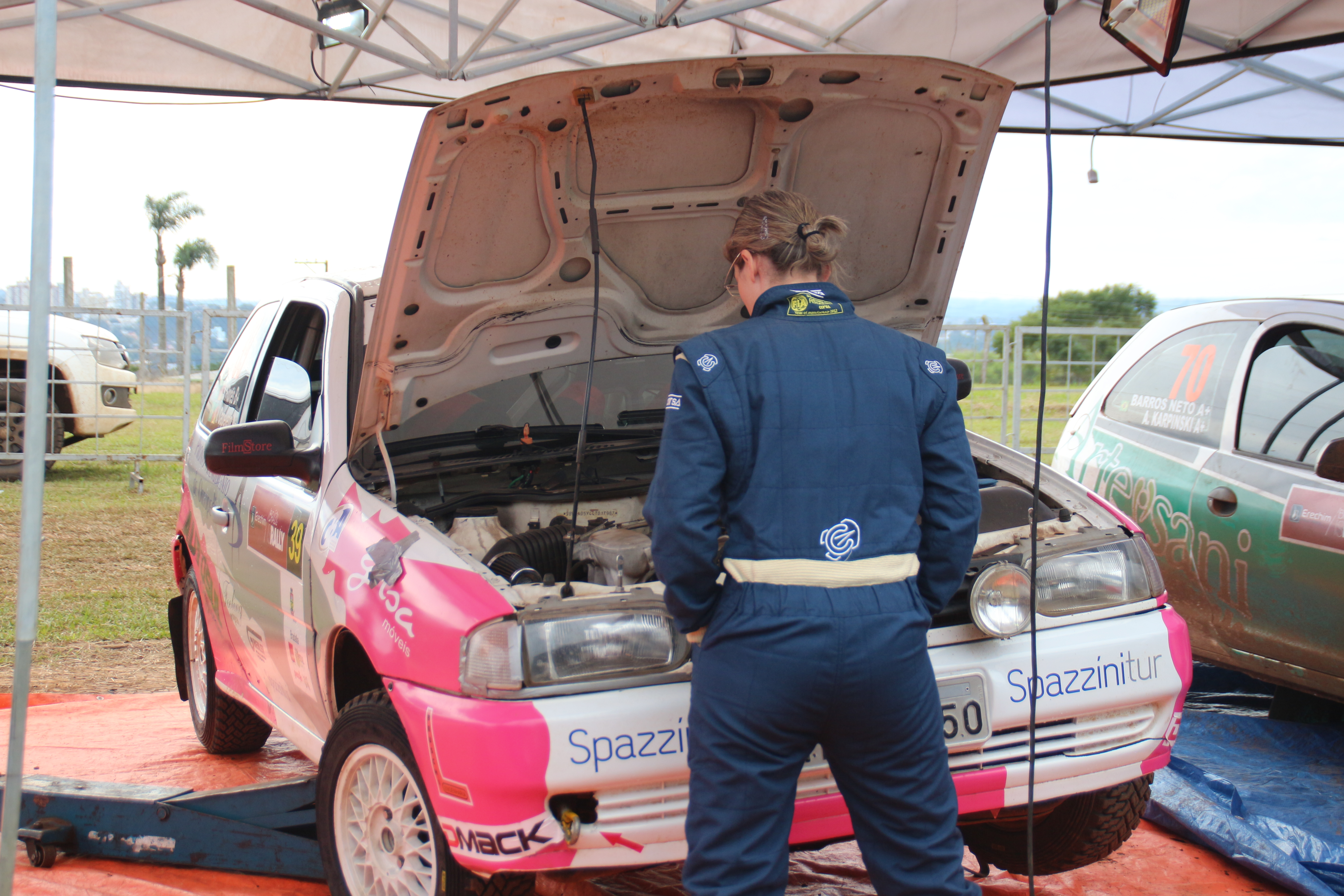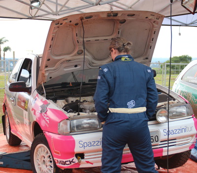 No meio dos roncos dos motores, a piloto Suelen Flores, acompanha atentamente o trabalho de seus mecânicos em seu carro. A erechinense que faz parceria com navegadora Viviane Capelleti, é a única piloto mulher do Erechim Rally 2016, além desta ser a única dupla formada apenas por mulheres.