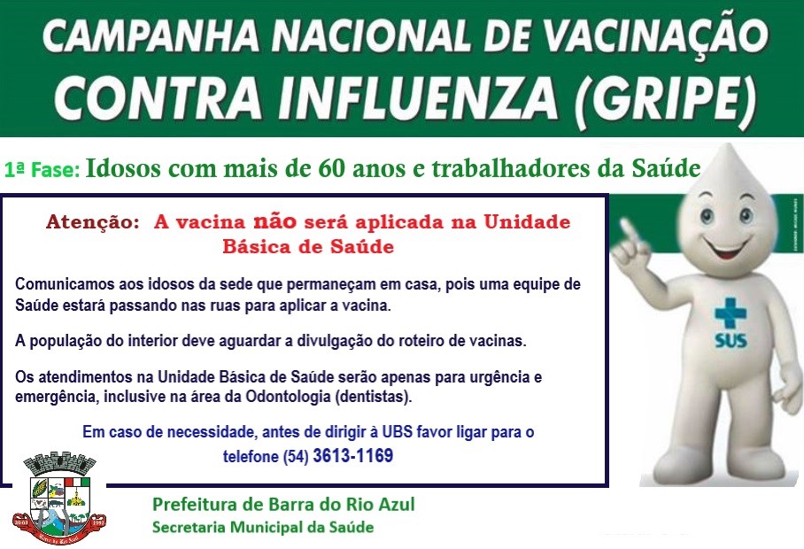 O Ministério da Saúde inicia nesta segunda-feira, 23 de março, a Campanha Nacional de Vacinação contra a Gripe. Nesta primeira etapa, os públicos prioritários serão idosos e trabalhadores da saúde. Para evitar deslocamento e aglomeração, a prefeitura de Barra do Rio Azul, por meio da Secretaria da Saúde, irá realizar a vacinação de idosos, a partir dos 60 anos, e dos profissionais da área da saúde em casa.