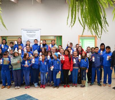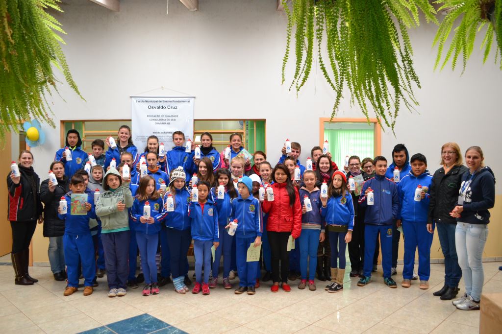 O município de Charrua distribuiu uma squeeze (garrafa) para cada aluno. Cada escola recebeu sua squeeze personalizada com a frase vencedora do concurso lançado no mês de abril.