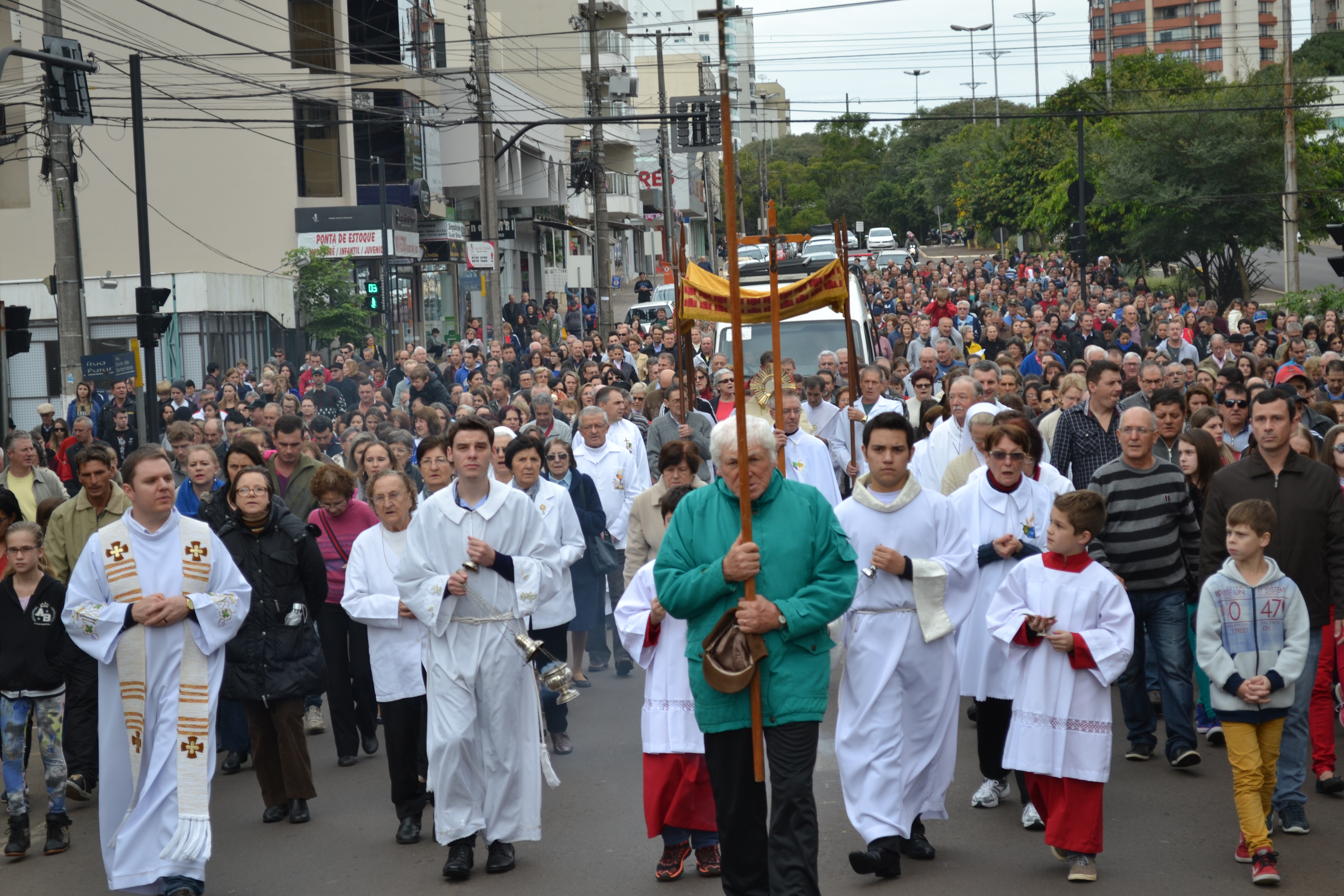 Procissões das paróquias Nossa Senhora Aparecida (Bairro Bela Vista) e São Cristóvão, se encontraram com os fiéis que seguiam do Seminário próximo à Praça Prefeito Jaime Lago. Acompanhados pelo bispo Dom José Gislon, que conduziu o ostensório, os fiéis seguiram pela Avenida Sete Setembro até a Catedral São José, local que foram recepcionados pelo tapete de lona e que foi realizada uma missa.
