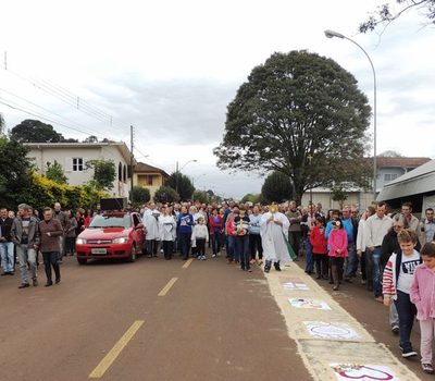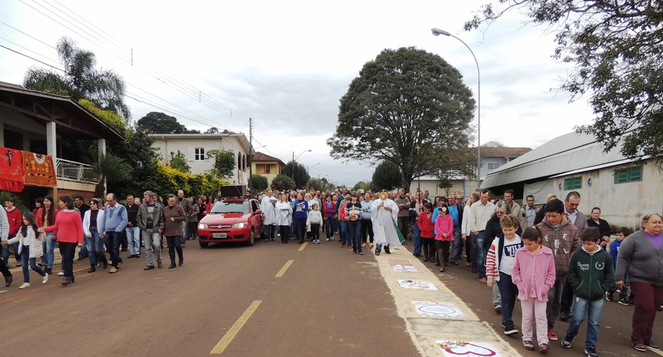 Desde o amanhecer da última quinta-feira, voluntários, membros das equipes de pastoral e de entidades sociais realizaram mutirão na confecção dos tapetes para a procissão e missa do Corpo de Deus, presididas pelo Pároco, Pe. Mauro Parcianello.