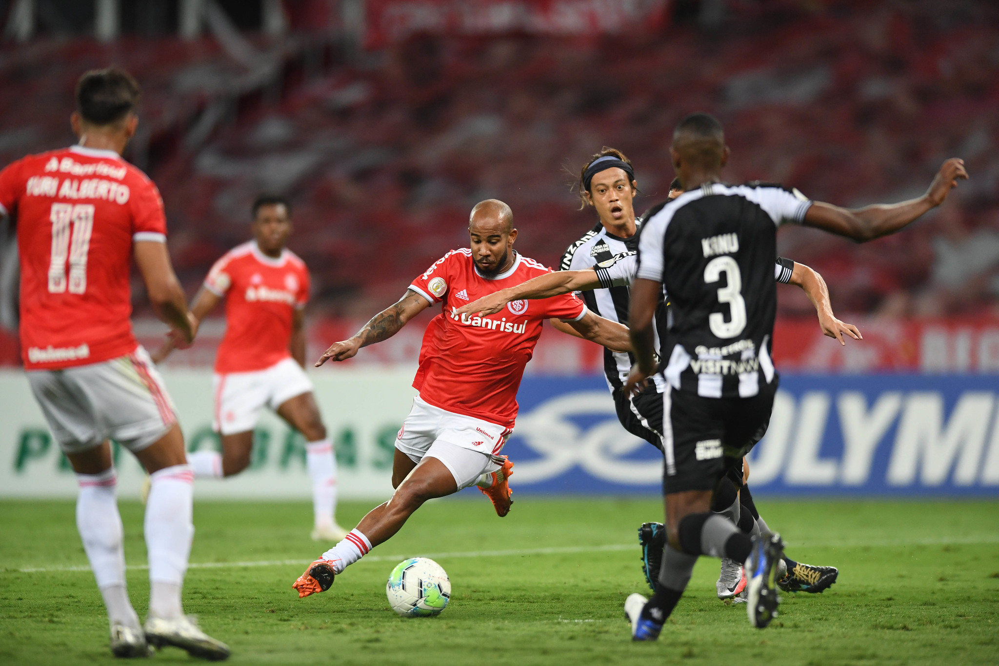 O Inter iniciou atacando, mas esbarrando na defesa do Botafogo, que mantinha duas linhas de quatro e reduzia espaços. Como consequência, os passes errados ocorreram em abundância para os dois lados.