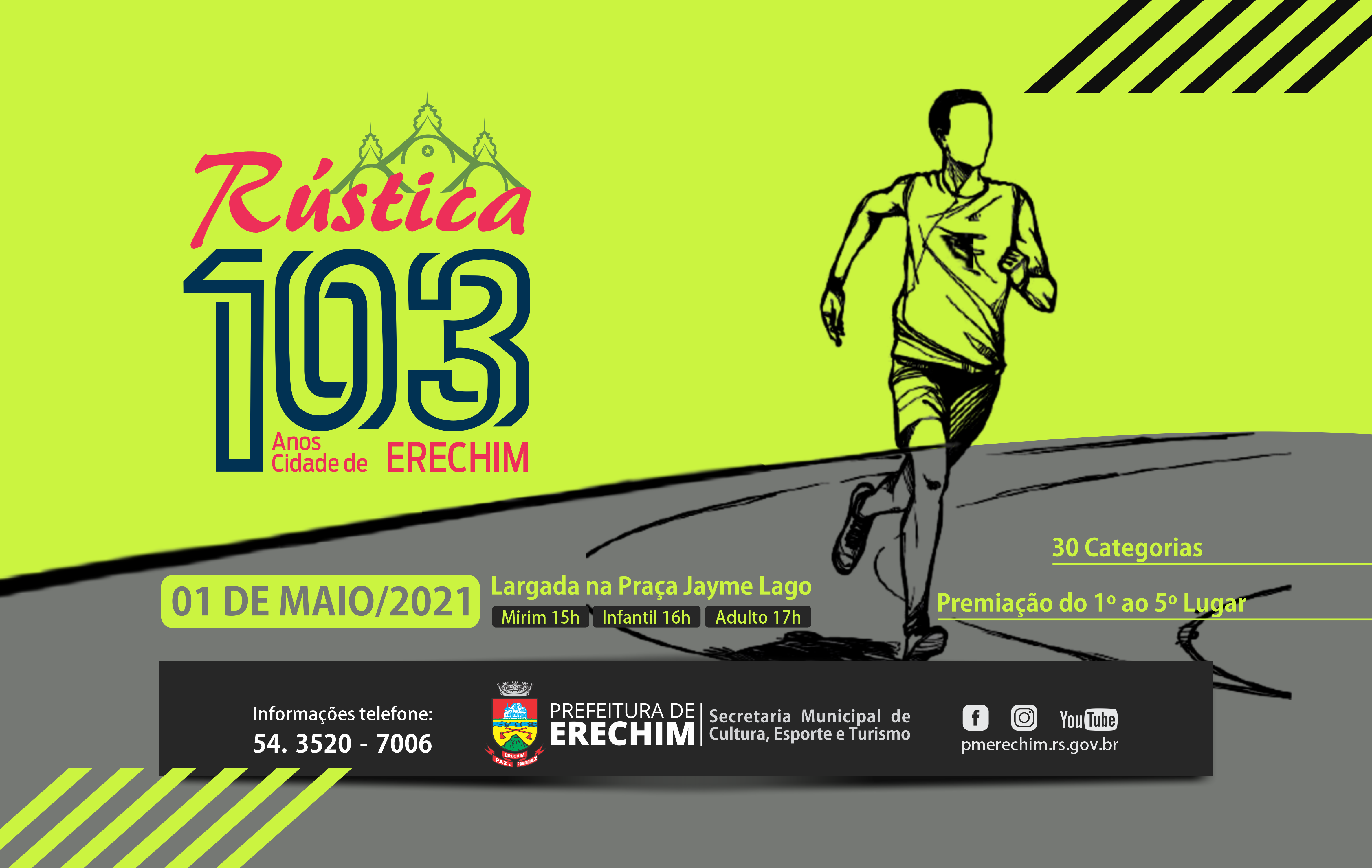 A Secretaria de Cultura, Esporte e Turismo, por meio do Departamento de Esportes, abriu na quarta-feira (24), as inscrições para a Rústica 103 Anos Cidade de Erechim. A prova tem previsão de acontecer no dia 1º de maio, mas poderá ser transferida dependendo da situação da Covid-19 e protocolos determinados pelo Governo do Estado no Modelo de Distanciamento Controlado.