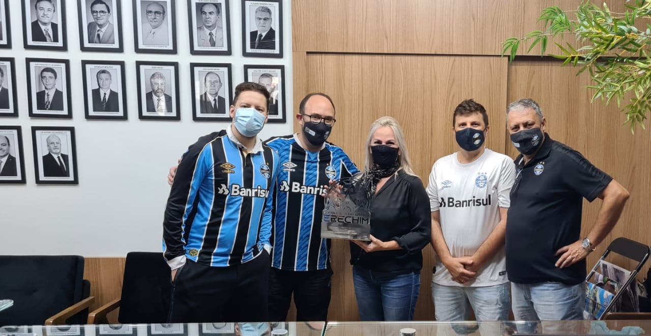 A presidente do Clube do Comércio, Katiamara Badalotti, recebeu, na manhã de sábado, 27, um troféu do Consulado do Grêmio de Erechim. Uma homenagem em reconhecimento à parceria entre as duas entidades nas ações de solidariedade realizadas em prol da sociedade em diversos momentos. Entregou o troféu à presidente do CC, o Cônsul do Grêmio em Erechim, Marcelo Basso, que estava acompanhado pelos cônsules adjuntos, João Pedro Emanuele e Dino Tomazelli, e mais integrantes do Consulado.