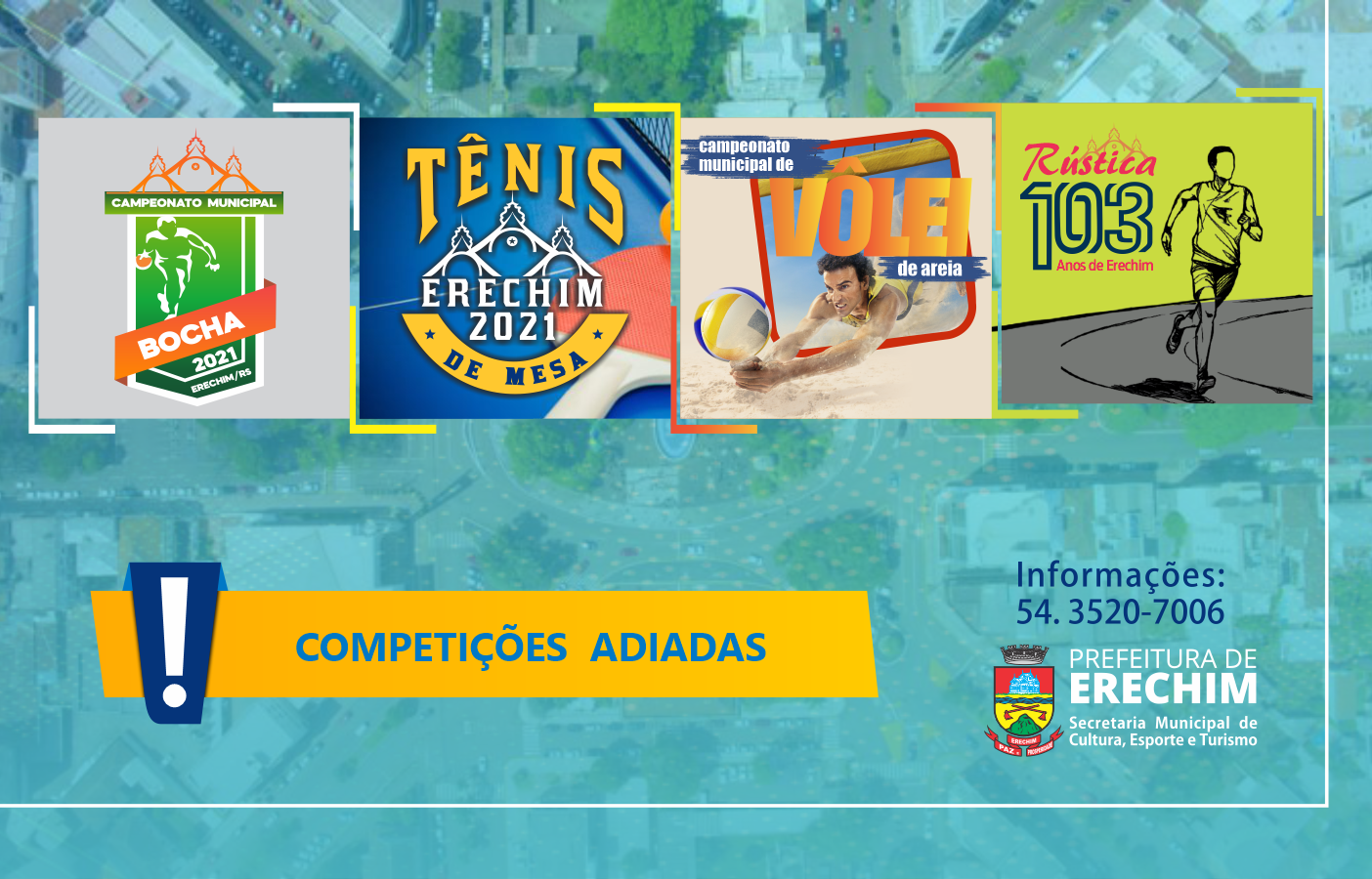Os campeonatos municipais de Bocha, Tênis de Mesa, Vôlei de Areia e também a Rústica 103 Anos Cidade de Erechim serão remarcados, tão logo os protocolos vigentes permitirem as competições sem prejuízos ou riscos à saúde.