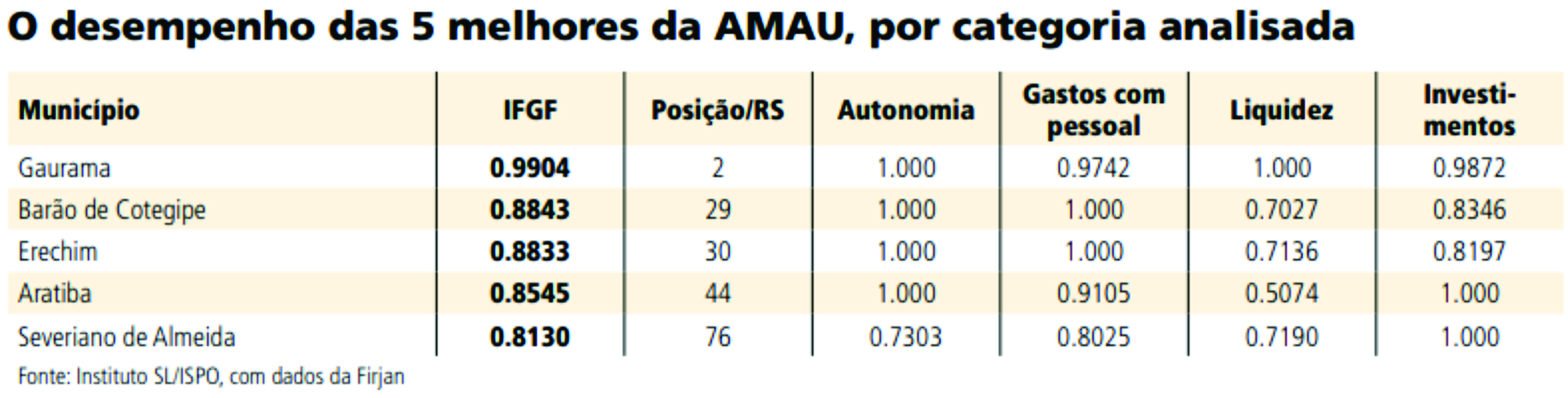 A região Alto Uruguai emplacou cinco de seus 32 municípios entre as 100 melhores gestões fiscais do Rio Grande do Sul, conforme o Índice Firjan de Gestão Fiscal (IFGF), divulgado na semana passada. O destaque ficou por conta de Gaurama, que apareceu na 2ª colocação estadual (sendo superada apenas por São Francisco de Paula) e na 14ª nacional. Na sequência, aparecem Barão de Cotegipe, 29ª posição estadual e 204º do País; Erechim, 30ª do RS (1ª entre as cidades gaúchas com mais de 100 mil habitantes) e 207ª do Brasil; Aratiba (44º e 331º); e Severiano de Almeida (76º e 537º).