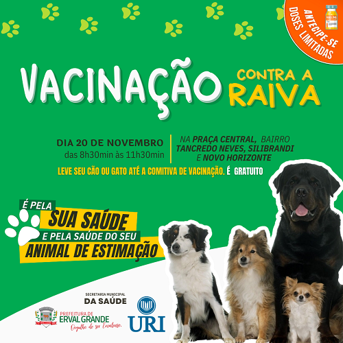 A raiva é uma doença perigosa, transmitida aos seres humanos através da exposição com a saliva de animais infectados com a doença, principalmente por meio da mordedura. Pensando na saúde da população e dos cuidados com os animais de estimação, pela primeira vez no município de Erval Grande será realizada a vacinação totalmente gratuita para cães e gatos.