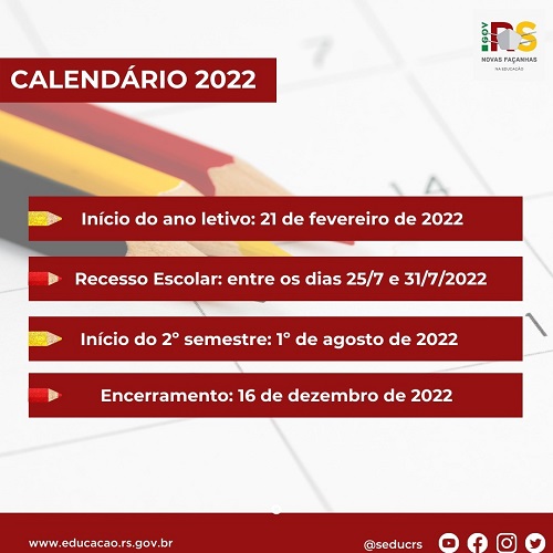 Conforme a portaria nº 300/2021, as aulas na rede pública estadual no ano letivo de 2022 ocorrem no modelo presencial e começam no dia 21 de fevereiro e se encerram no dia 16 de dezembro.