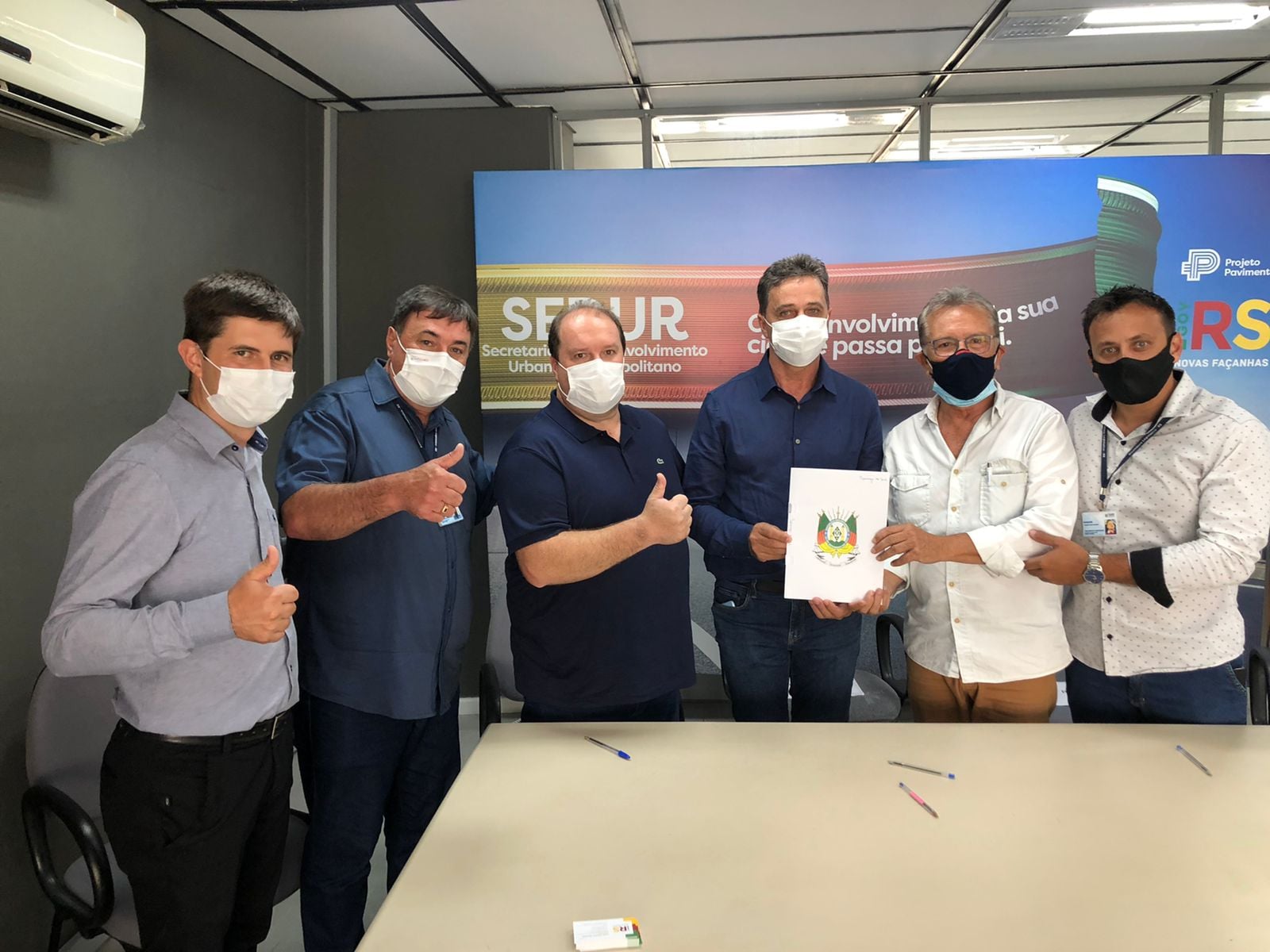 O secretário de Apoio e Articulação com os Município, Luiz Carlos Busato, e assessores do deputado, Dirceu Franciscon, receberam o prefeito, Marco Antonio Sana, o vice-prefeito, Fabiano Luiz Klein, o secretário da Educação Dejair Pasa, para o ato de assinatura do Programa Pavimenta RS. O valor total da obra é de R$ 953.677,25 sendo R$ 667.574,08 o valor concedente pelo Tesouro do Estado e R$ 286.103,17 como a contrapartida do município.