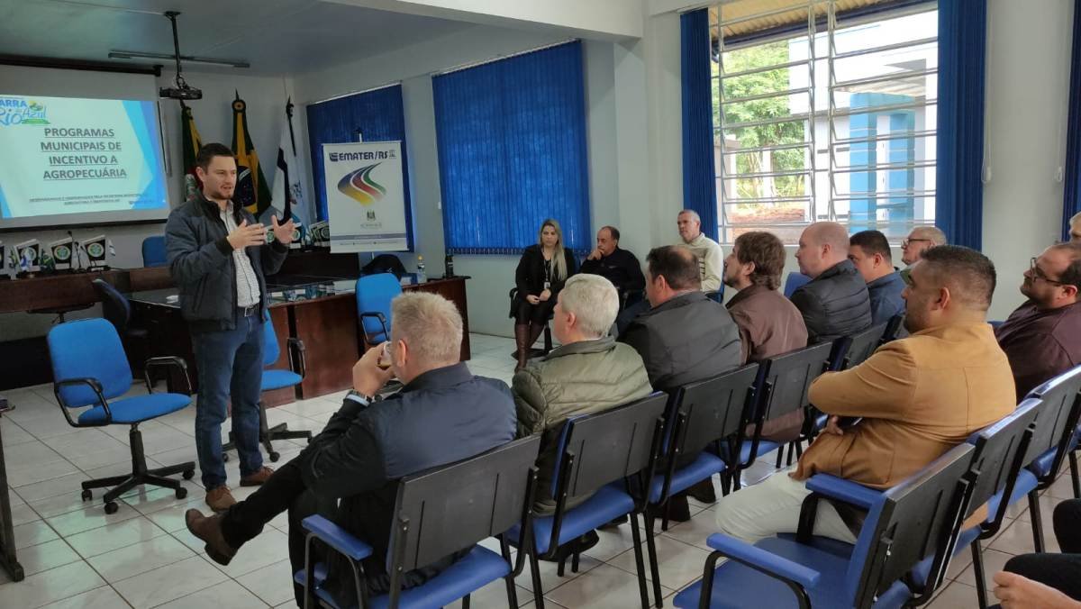 Na parte da manhã, as autoridades foram recepcionadas na Câmara de Vereadores. O prefeito Marcelo Arruda e a equipe do Escritório Municipal da Emater/Ascar, Jair Zorzanello e Léia Hausen, explanaram os principais programas municipais e os investimentos de incentivo aos produtores, realizados pelo Poder Público.