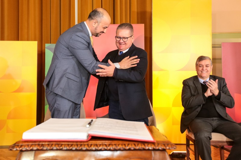 O governador Ranolfo Vieira Júnior empossou, na manhã desta segunda-feira (13/6), o novo secretário de Desenvolvimento Econômico, Joel Maraschin. A cerimônia ocorreu no Salão Alberto Pasqualini do Palácio Piratini e contou com a presença de secretários, autoridades e representantes de entidades.