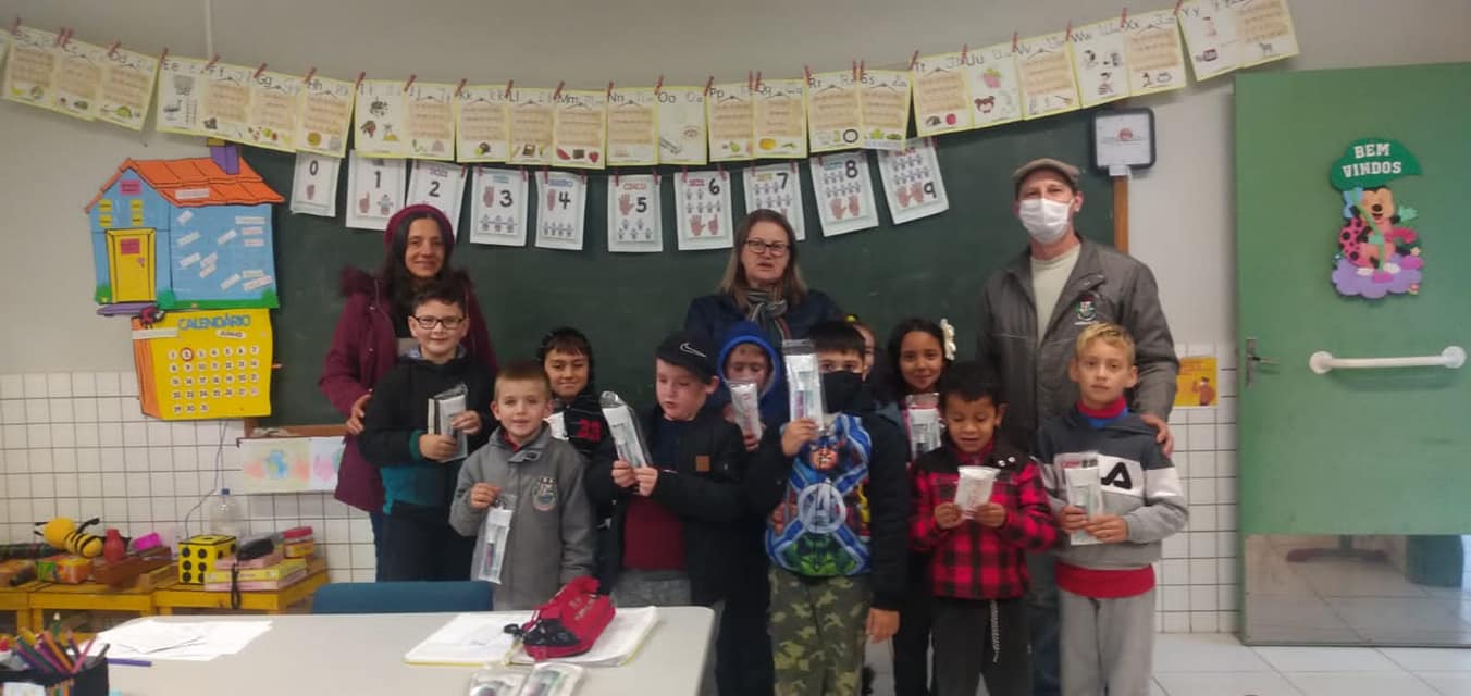 Neste primeiro semestre de 2022 tiveram início as atividades relacionadas à saúde bucal. Foram entregues a cada aluno das séries iniciais, de forma gratuita, um kit com creme dental, escova e fio dental.