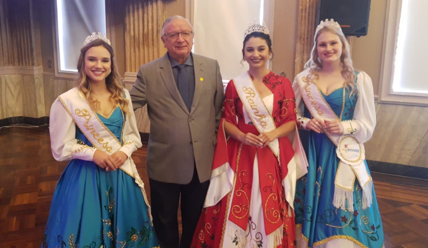 A corte da Frinape 2022, representada pela Rainha Nathália Gonçalves Spagnol e as princesas Laura Skonra Pezzin e Sabrina Boller, mantiveram na quarta-feira, 5, agenda em Porto Alegre. O diretor do Instituto Unimed RS, Dr. Alcides Mandelli Stumpf acompanhou a corte na Federasul