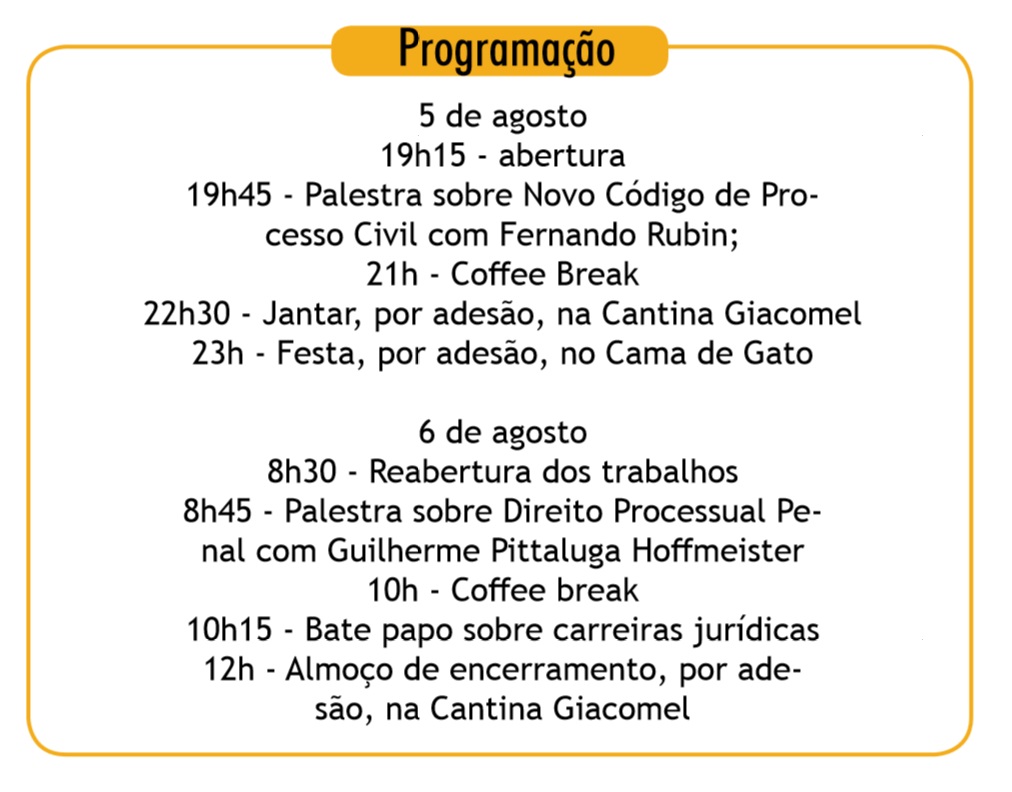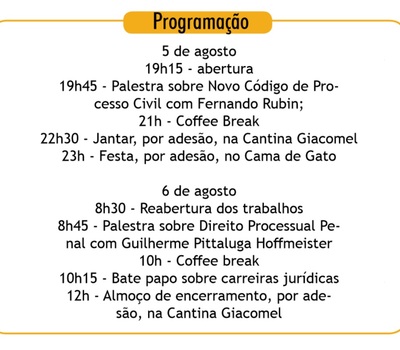 O evento terá ainda bate-papo sobre carreiras jurídicas, com a participação de promotor, juiz, delegada, defensora pública e advogado de Erechim. Inscrições ainda podem ser realizadas. Mais informações podem ser consultadas na página do evento no Facebook, clicando aqui.
