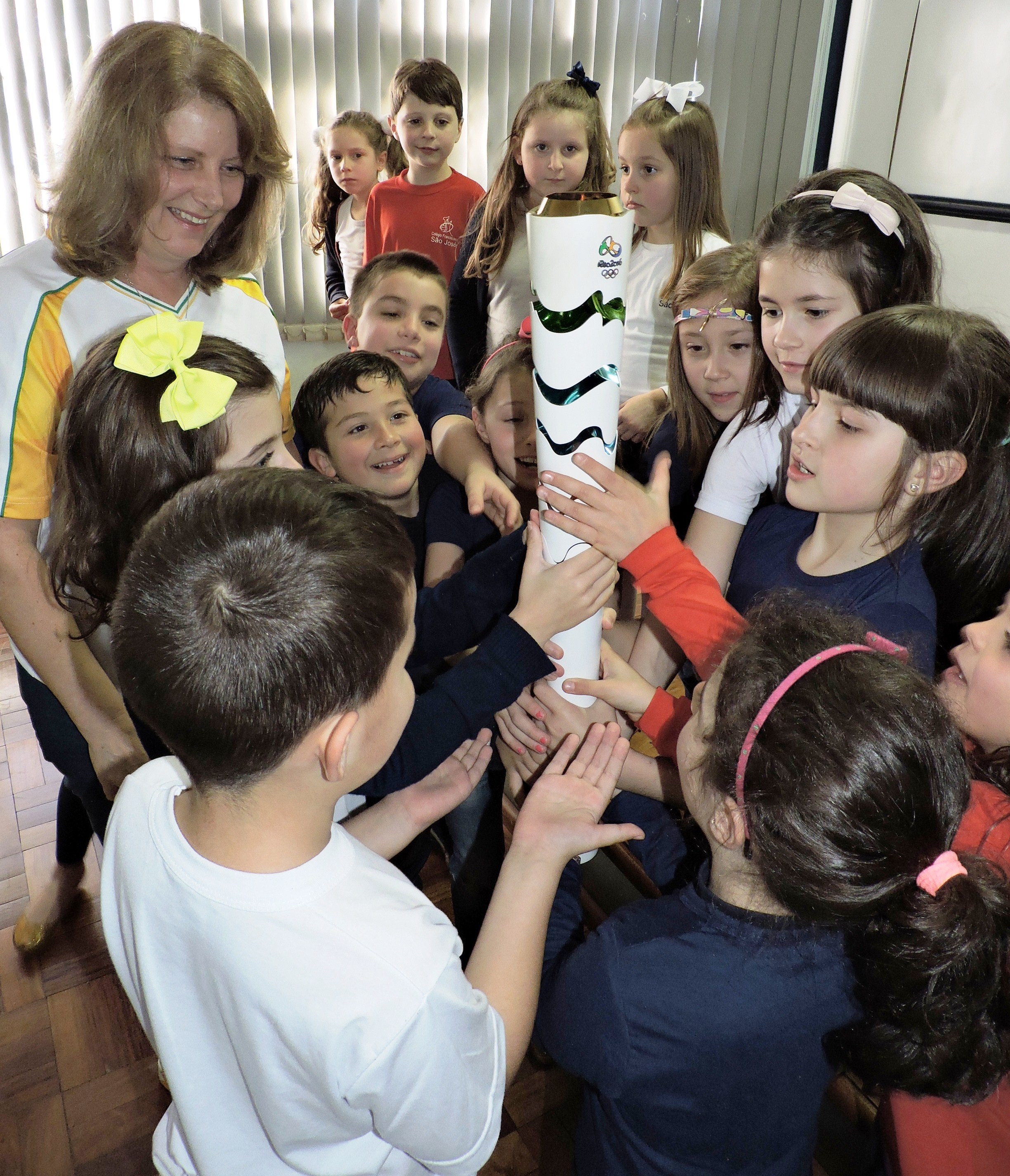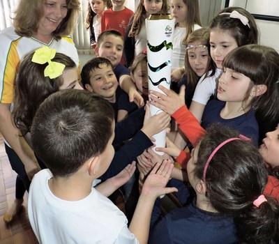 Na quinta-feira (4), os alunos do 1º ao 4º ano do Ensino Fundamental assistiram à palestra com a professora de Educação Física já aposentada, Ana EliseSantinBiason, que foi inscrita pelo filho no Comitê Olímpico para participar do revezamento da Tocha Olímpica em Erechim.Com o exemplar da Tocha em mãos, Ana relatou como aconteceu sua seleção e contou o que sentiu ao conduzir o símbolo das Olimpíadas, resumindo o sentimento na palavra gratidão. Também comentou com os estudantes que 12 mil exemplares da Tocha foram confeccionados, um para cada condutor, observando que este modelo, feito em alumínio reciclável para não agredir o meio ambiente, é considerado o mais bonito de todos os desenvolvidos até hoje. Explicou, ainda, o significado das cores e do triângulo contidos nela, revelando que nesta semana irá ao Rio de Janeiro acompanhar os jogos de vôlei, basquete, handebol, tênis e ginástica artística.