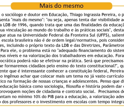 Professores de Erechim consideram a proposta interessante, entretanto, afirmam que as temáticas da Constituição já são trabalhadas nas escolas de maneira informal. O diretor do Colégio Estadual Professor Mantovani, Roberto Bagattini, vê a proposta com bons olhos. “Acredito que é a partir destes estudos que os alunos poderão conhecer a estrutura política, bem como seu papel na sociedade, além de exercerem a cidadania. A escola é a referência de muitas pessoas, então nada mais justo do que partir dela o ensino da Constituição Federal”, pondera ele.