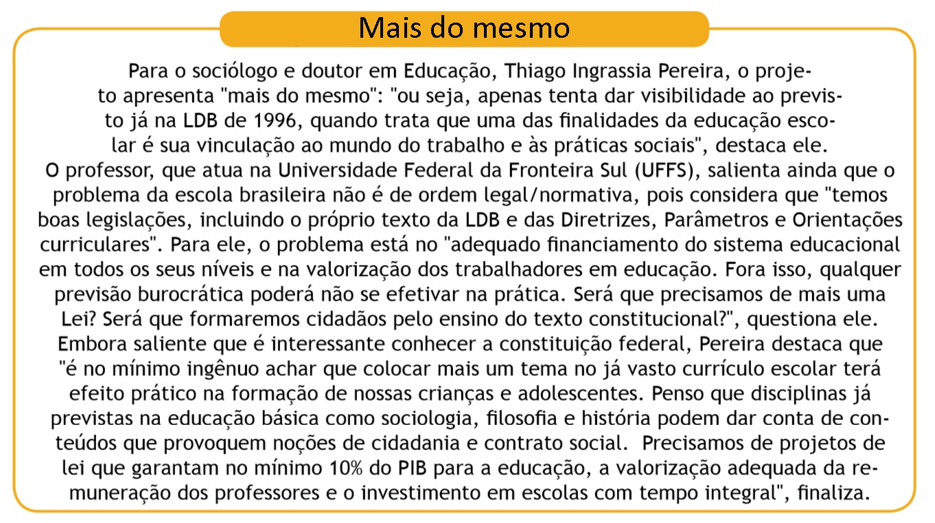Conforme a Agência Senado, a proposta acrescenta à Lei de Diretrizes e Bases da Educação Nacional (Lei 9.394/1996) como diretriz do conteúdo curricular da educação básica a difusão de valores fundamentais ao interesse social e aos direitos e deveres dos cidadãos e de respeito ao bem comum e à ordem democrática, com a introdução do estudo da Constituição Federal
