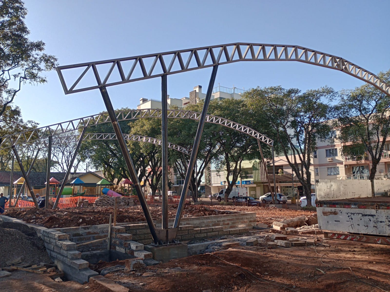 As obras de revitalização da Praça Carlos João Busanello, de Gaurama, seguem em andamento no centro da cidade. Após a remoção das árvores, retirada e classificação do material, colocação das estacas e fundações, agora está sendo realizada a instalação da estrutura da cobertura. Além de fornecer abrigo para o palco e camarim, a nova estrutura funcionará como um ambiente amplo e mais confortável para o público desfrutar dos eventos realizados no local.
