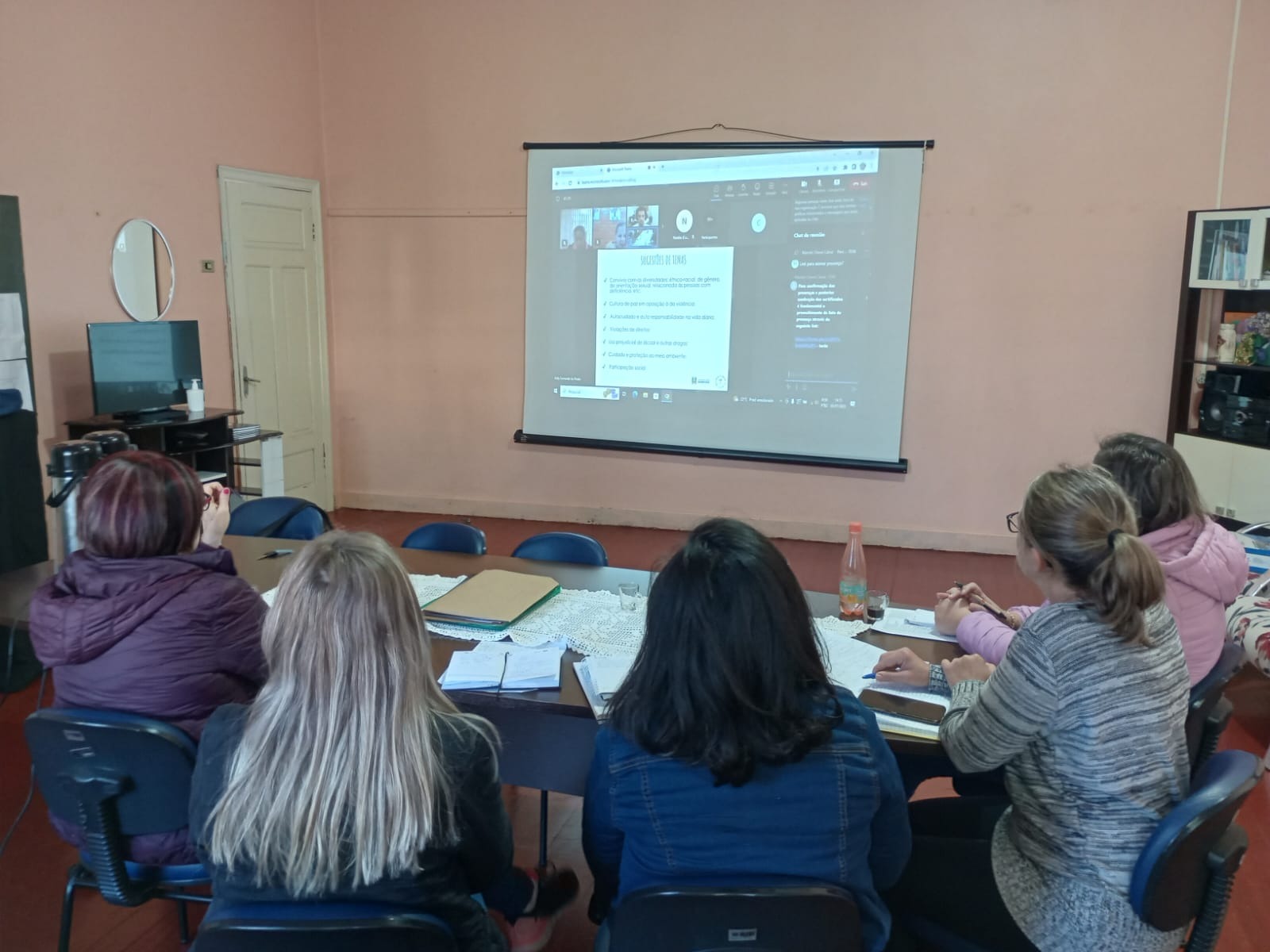 O evento foi online, e a equipe formada pela secretária de Assistência Social Eliana Katia Bruschi Bergamo, pelas psicólogas Lilian Falcão Sturmer dos Santos e Marlene de Paula, pela assistente social Eliane Banoski de David e pela responsável pelo bolsa família Adriana Regina Gehlen, acompanhou as atividades da sala de reuniões do CRAS.